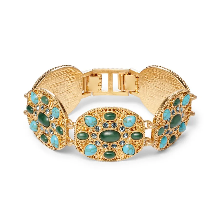 The late 19th–early 20th-century Tibetan amulet box, or ga’u, that inspired this bejeweled bracelet would have been worn around the neck to protect the wearer. Its form, comprising two intersecting squares that symbolize crossed vajras, or thunderbolts, suggests the stability of Buddhism, while its striking stone embellishments represent the crystalline nature of the heavens. Amulet boxes typically contained written or printed texts consecrated by monks, and often included pieces of cloth from an important lama’s robes. The eye-catching example in The Met collection belonged to a larger jewelry ensemble owned by a noblewoman.