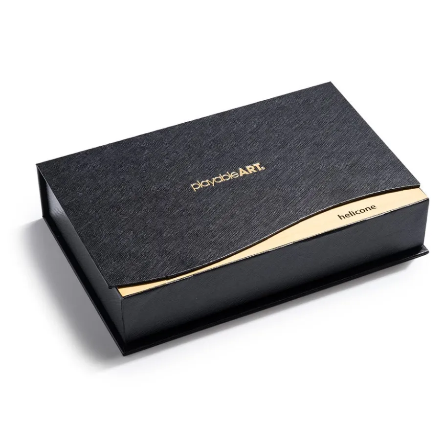 Instantly transform the Helicone with one quick twist, changing this intriguing kinetic sculpture from a helix into a pinecone, and then back again. The Helicone features 38 precise, laser-cut pieces assembled on a brass tube and attached to a solid wood base. The aesthetic structure of the Helicone is based on the same mathematical concepts found in nature, such as the golden angle and the Fibonacci numbers. A piece of expressive, playful tabletop art for both adults and kids.