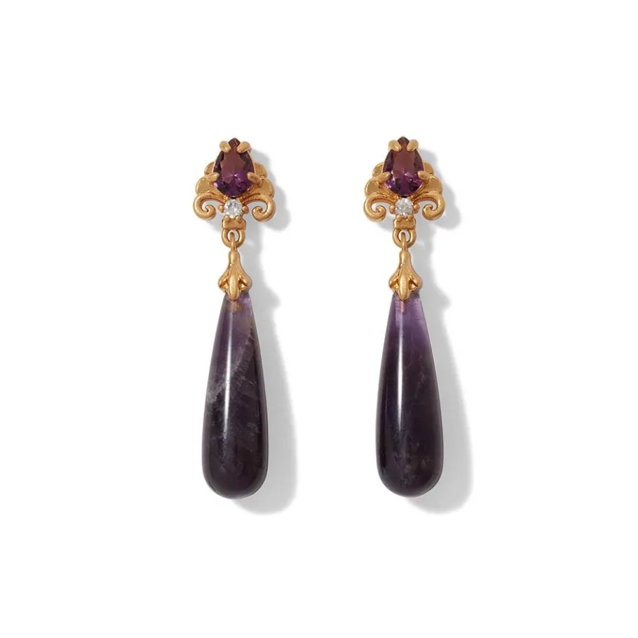 These eye-catching amethyst earrings pay tribute to the unusual purple detailing on a Turkish textile fragment (ca. 1570–80) in The Met’s Islamic art galleries. The Museum’s woven work, probably crafted in Istanbul during the late 16th century, bears an ogival lattice design (derived from the term “ogive,” which refers to a pointed arch) and serves as an outstanding example of the luxe Ottoman fabrics known as kemha. These sumptuous silk fabrics were highly valued throughout the Mediterranean and beyond, and many of them were used to make Christian vestments across Europe. The shape of this particular textile indicates that it was probably part of a chasuble, a garment worn by a member of the clergy.