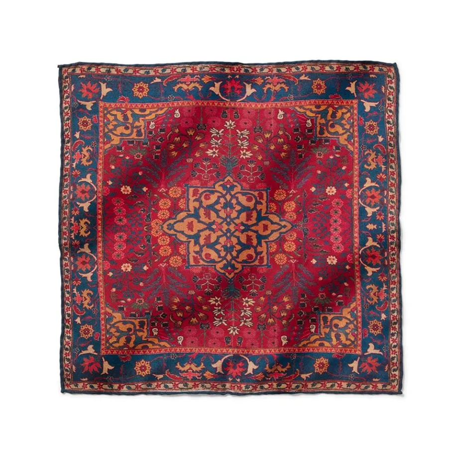 The striking design on this pocket square is derived from a sumptuous 17th-century carpet in The Met’s Islamic art collection. Made in Iran, probably Kirman, the Museum’s carpet is abundant with naturalistic flowers and plants, which are contained within four quarter medallions in the corners and organize around a medallion in the center. So-called “vase” carpets such as this one were named for the sporadic presence of vases in the pattern.
