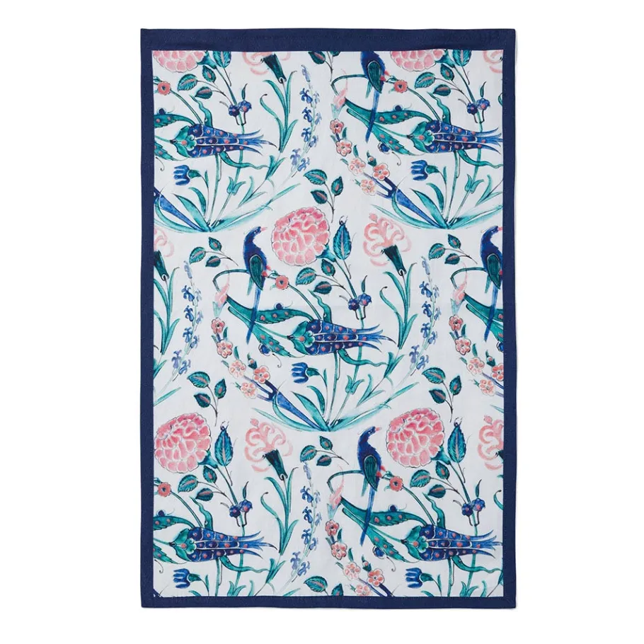 The tranquil scene on this tea set, which includes a tin of The Met x Harney & Sons: Iznik Garden Black Currant tea, a tea-infusing covered mug, and a tea towel, comes from a remarkable stonepaste dish (ca. 1575–90) in The Met collection. Crafted in the renowned Iznik kilns, the Turkish dish is adorned with colorful carnations, tulips, and hyacinths, as well as two small birds subtly perched amid the tangle. These flowers, sometimes in combination with birds, were pervasive decorative elements on 16th- and 17th-century Iznik creations.